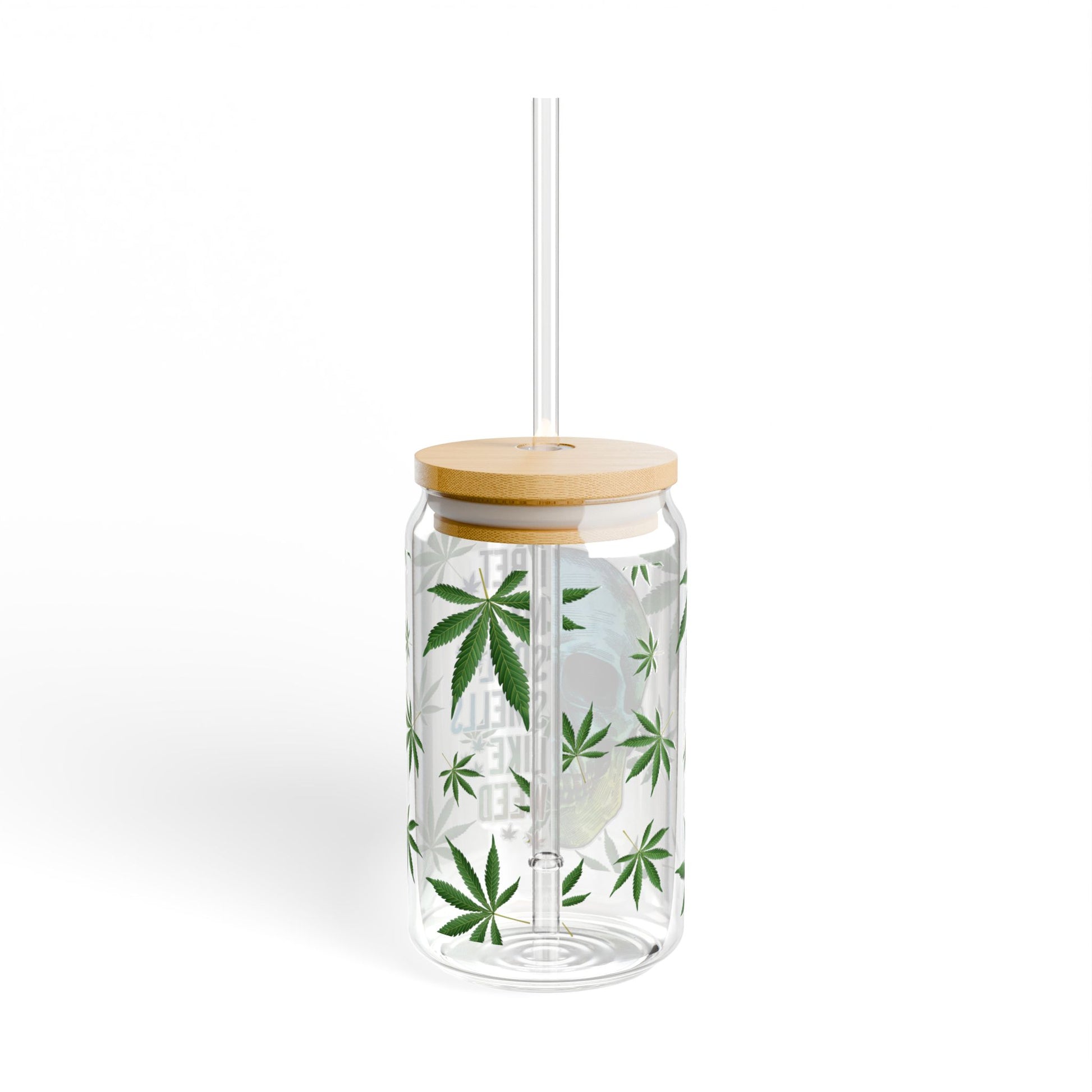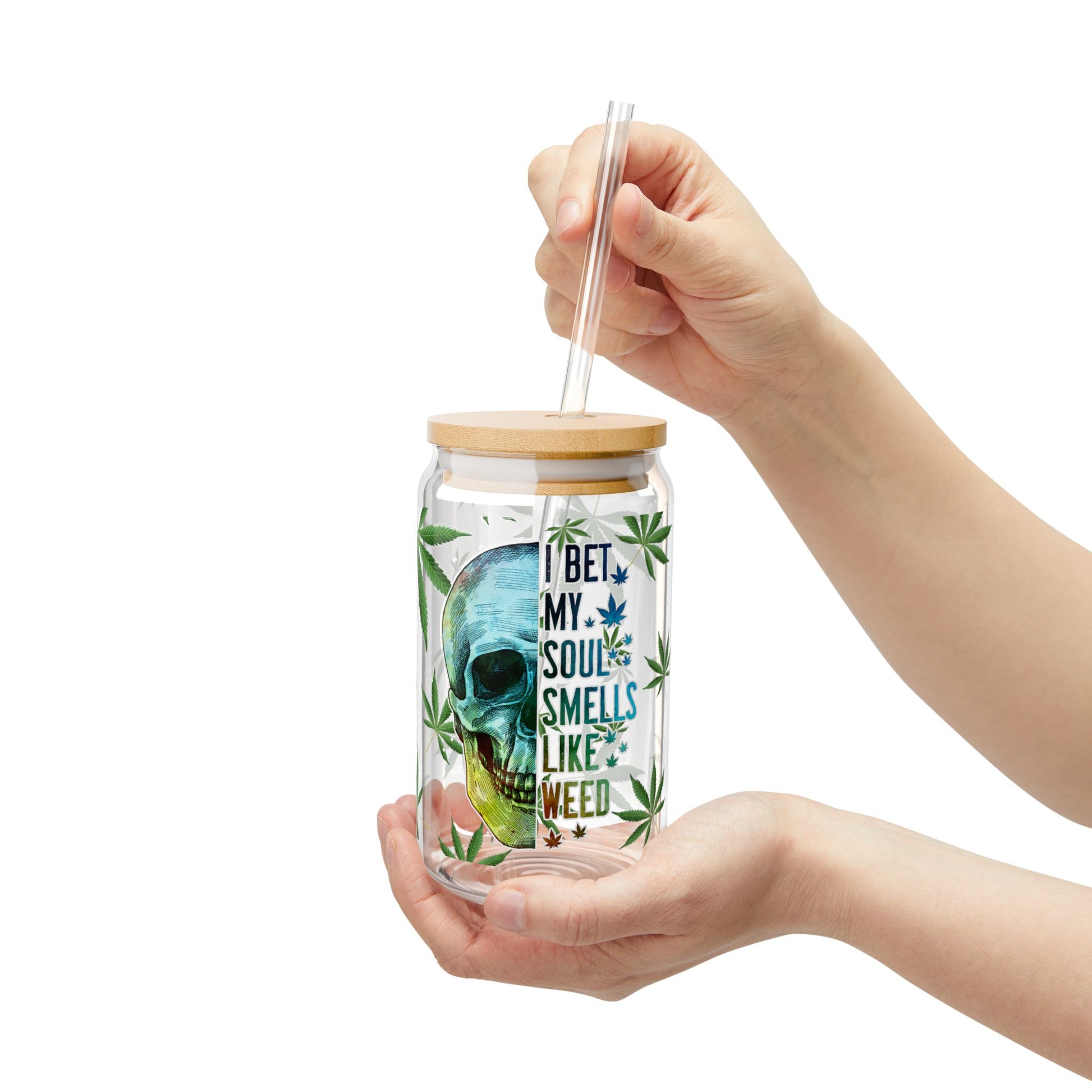 16oz Glass Mason Sipper – “I Bet My Soul Smells Like Weed” Skull & Cannabis Design