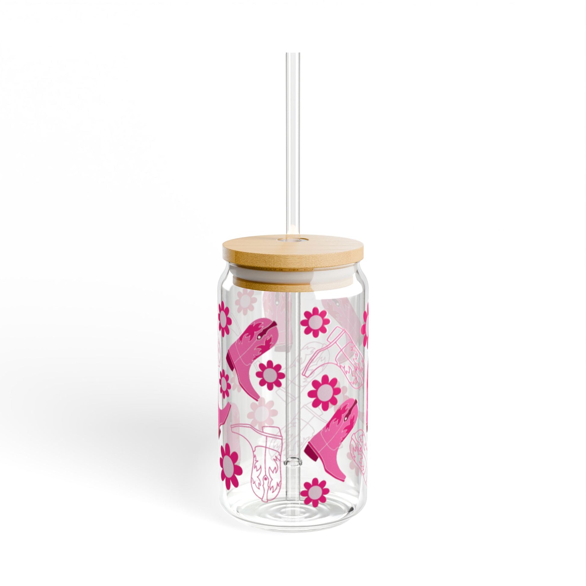 Sip with a wink of retro charm. This 16oz clear sipper glass shows off a playful pink cowboy-boot and daisy pattern that turns every drink into a small celebration. Lightweight and crystal-clear, the tempered glass keeps the colorful print bright while the optional bamboo push lid and Tritan straw make it easy to take your iced coffee, lemonade, or iced tea on the go — without sacrificing style. It feels like a sunny porch visit: easy, bright, and a little bit cheeky.