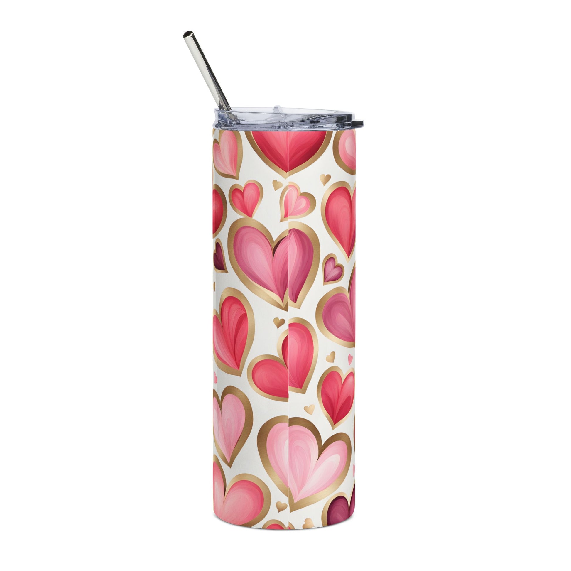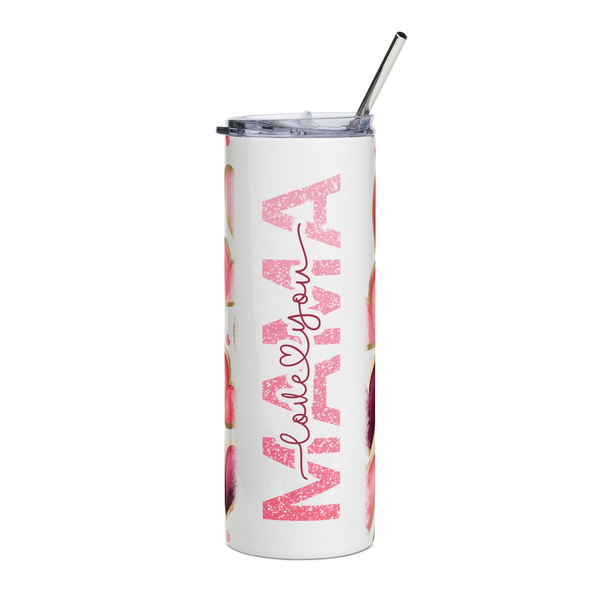 This slim 20 oz stainless steel tumbler carries a gentle, hand-painted romance. Warm pink hearts cascade around the cylinder while a soft, textured script reads “MAMA” with a tiny handwritten note tucked into the letters — a quiet celebration of motherhood and everyday tenderness. The glossy varnish catches light and makes the watercolor-style hearts pop, while the tall, narrow profile fits most cup holders for on-the-go mornings and stroller-side sips. Use it for warm cocoa during late-night feedings, iced coffee between errands, or as a cozy companion on a chilly porch. It feels personal, like a little reminder of love in the rush of daily life.