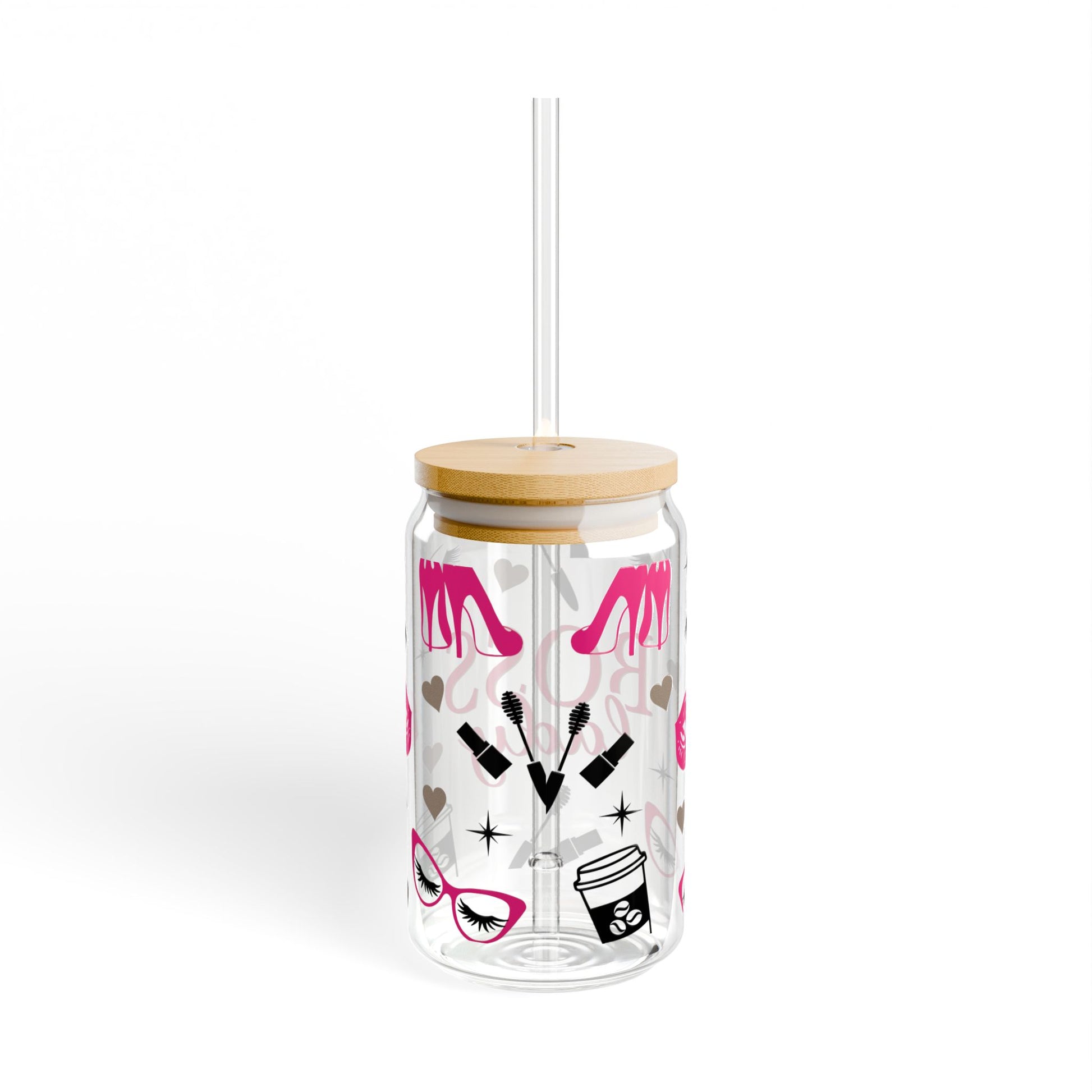 Sip with confidence. This 16oz clear sipper glass holds your favorite cold drinks while showing off a bold, feminine design—glossy pink "Boss Lady" lettering surrounded by makeup icons and playful hearts. The tempered glass feels sturdy in hand and the optional bamboo push lid with clear Tritan straw keeps spills low while adding a natural, warm accent. It’s lightweight enough to carry between meetings, morning commutes, and creative sessions, and colorful printing keeps the pattern bright and true. Hand wash gently to maintain the finish.