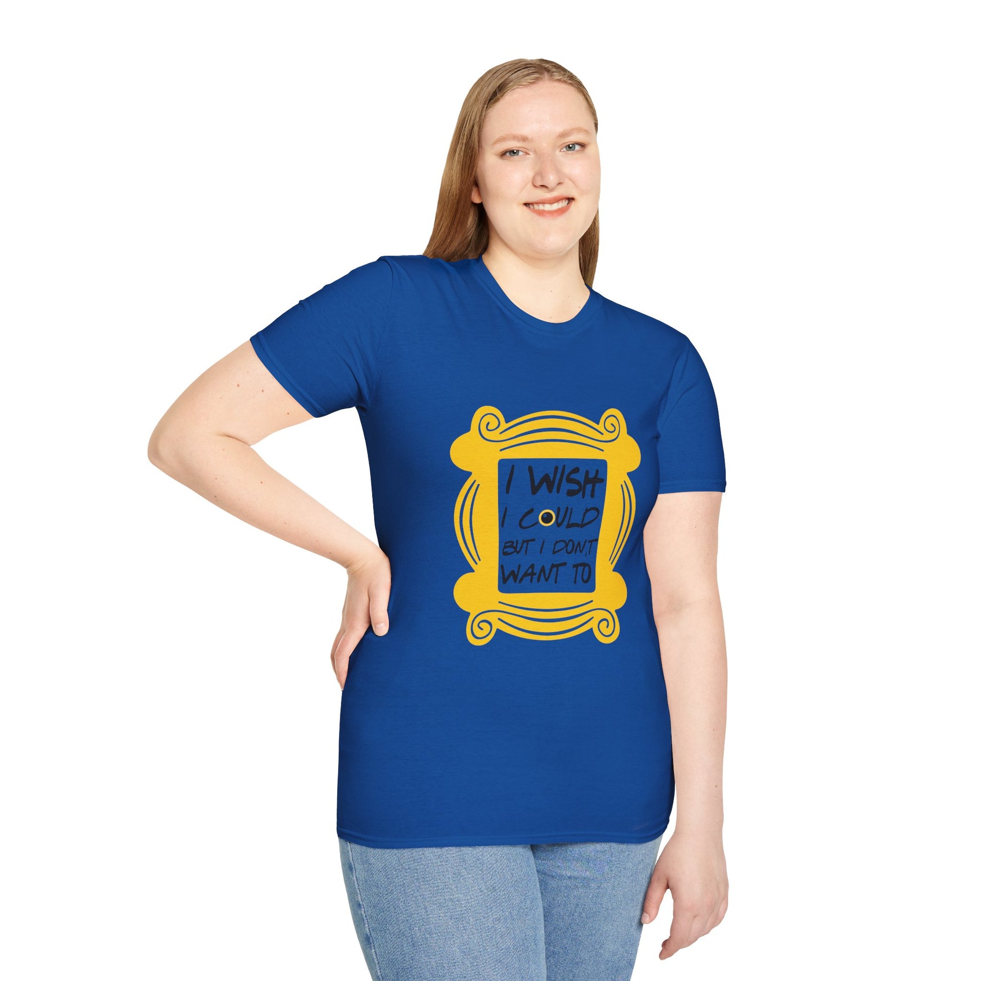 Soft, casual tee with a playful, familiar design that reads “I WISH I COULD BUT I DON’T WANT TO” framed by a whimsical yellow picture-frame motif. Lightweight ring-spun cotton gives it a smooth, breathable feel that layers easily under a jacket or stands alone on warm days. The handwritten-style message carries a breezy, slightly sarcastic tone — for people who appreciate blunt humor and low-effort days. Wear it to coffee runs, lazy weekends, or when you need a quiet, honest statement without saying a word.