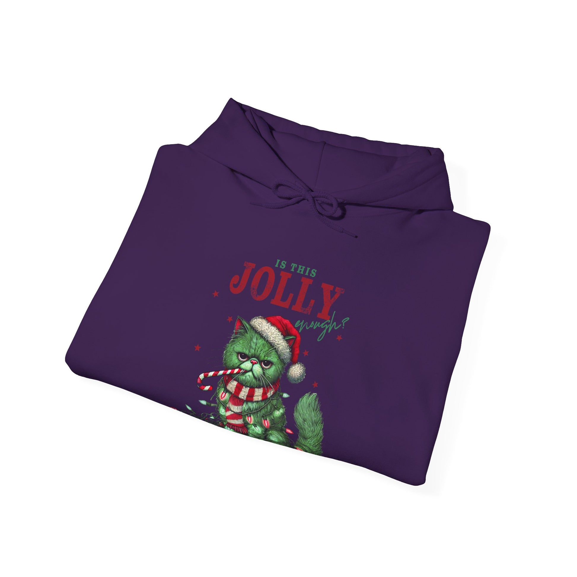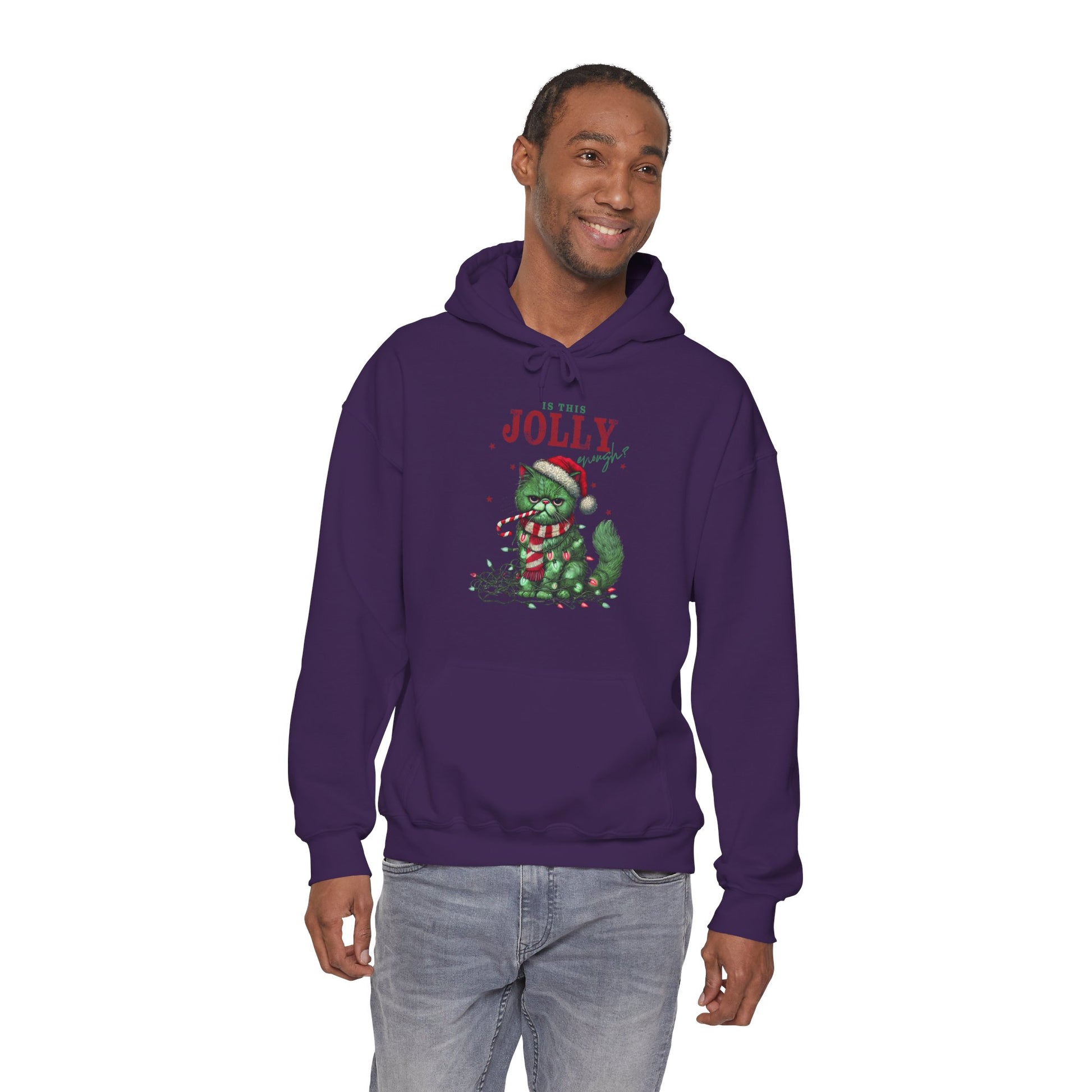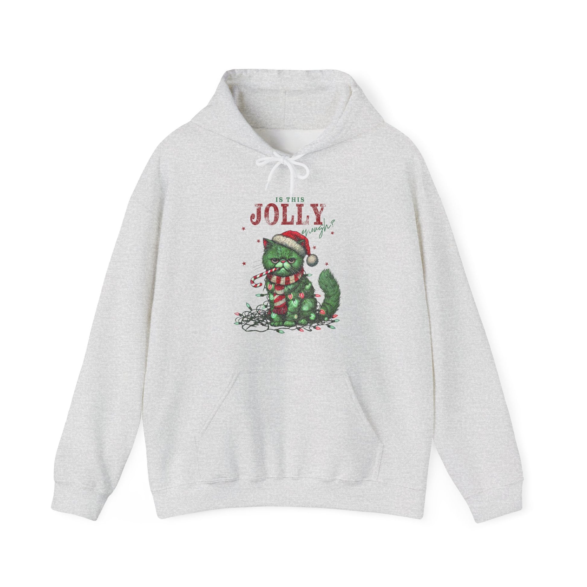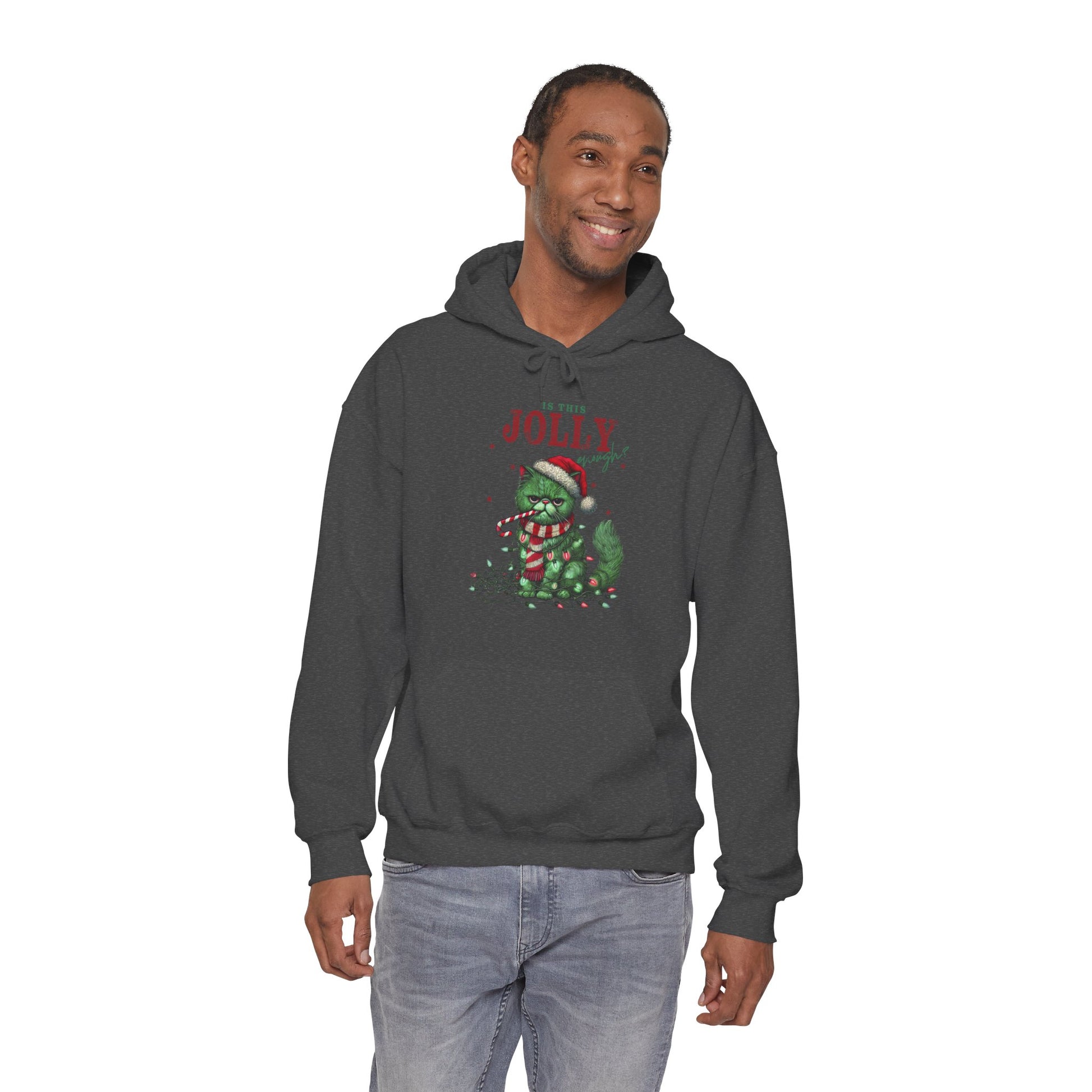 Wrap yourself in cozy holiday mischief with this soft, medium-weight hooded sweatshirt featuring a whimsical green cat in a striped scarf and Santa hat. The hand-drawn illustration sits centered on the chest with cheerful lettering that reads “Jolly,” bringing a playful, nostalgic vibe to winter walks, tree-lighting nights, and fireside movie marathons. The roomy kangaroo pocket and double-lined hood hold warmth and small essentials. Durable cotton-poly blend holds color and print detail wash after wash, while tear-away neck labels keep wearing scratch-free. Wear it when you want a little festive grin in your day — whether you’re trimming the tree, sipping hot cocoa, or strolling through string lights.