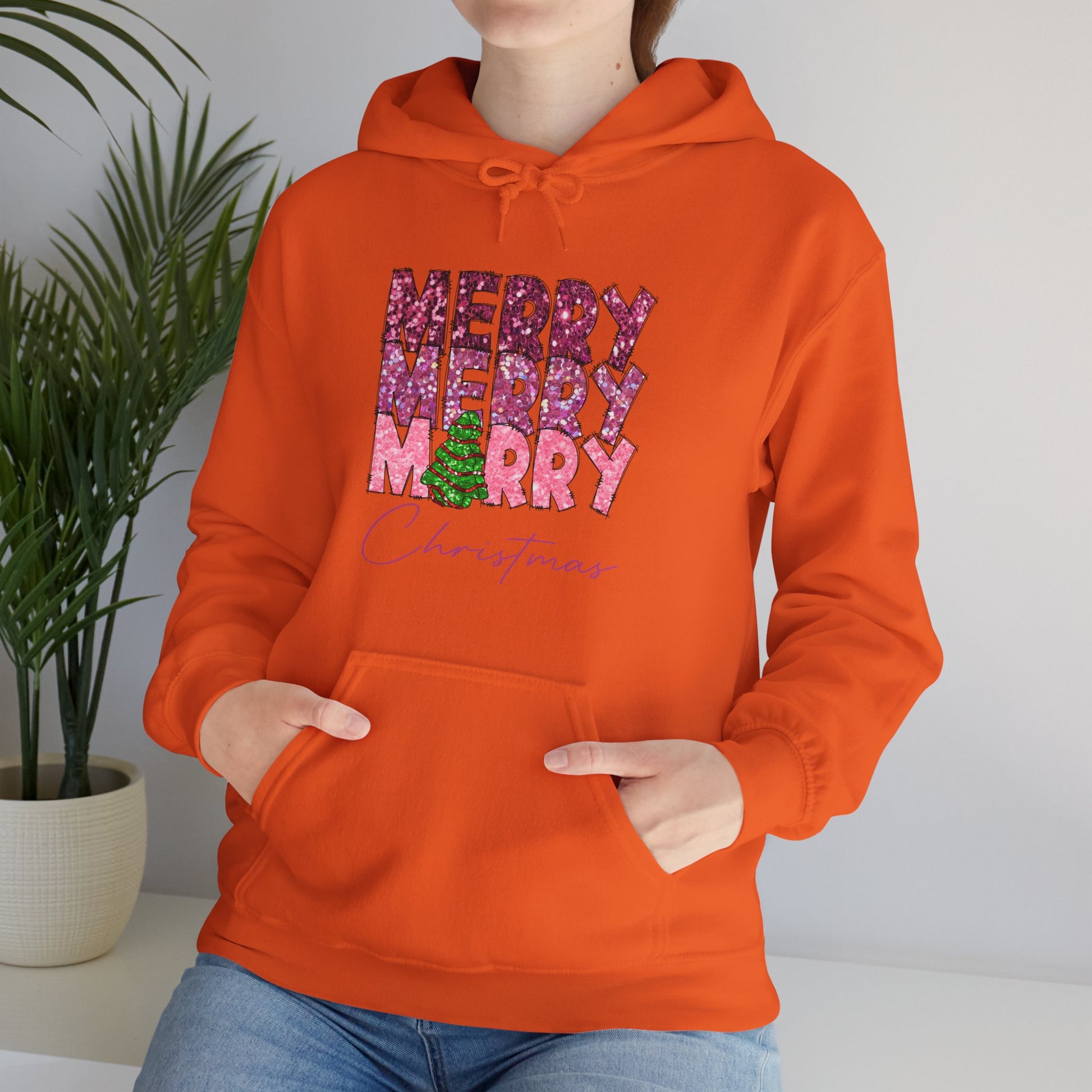 A cozy, soft hoodie that brings playful holiday cheer without shouting for attention. The front features stacked, patterned “MERRY” lettering in warm pinks and greens with a subtle scripted “Christmas” beneath — a fresh, modern take on seasonal graphics. The roomy kangaroo pocket and double-lined hood make it easy to layer over tees or thermals during crisp winter walks or relaxed evenings by twinkling lights. It wears like a familiar favorite: warm, comfortable, and quietly festive — the kind of sweatshirt you reach for when you want holiday spirit with a relaxed, personal vibe.