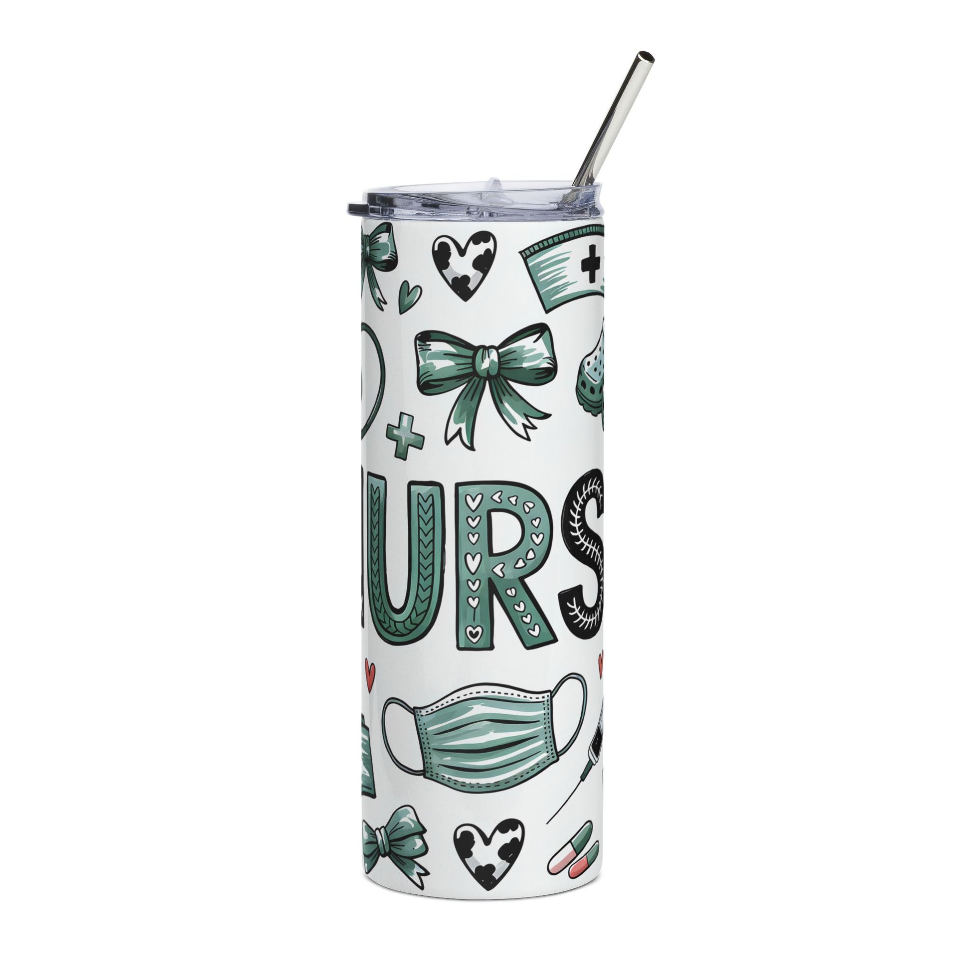 A tall, slim stainless steel tumbler wrapped in cheerful nurse-themed illustrations — surgical masks, stethoscopes, bandages, hearts and bows in soft teal and black. The 20 oz design fits easily into cup holders and keeps drinks secure with a clear lid and metal straw. The glossy protective finish makes the artwork pop while resisting scratches. Lightweight and durable, this tumbler lives on busy shifts, study sessions, and long commutes, carrying hot coffee or cold water with style and a little humor. It reads like a small nod of appreciation for caregivers, offering everyday usefulness and personality.