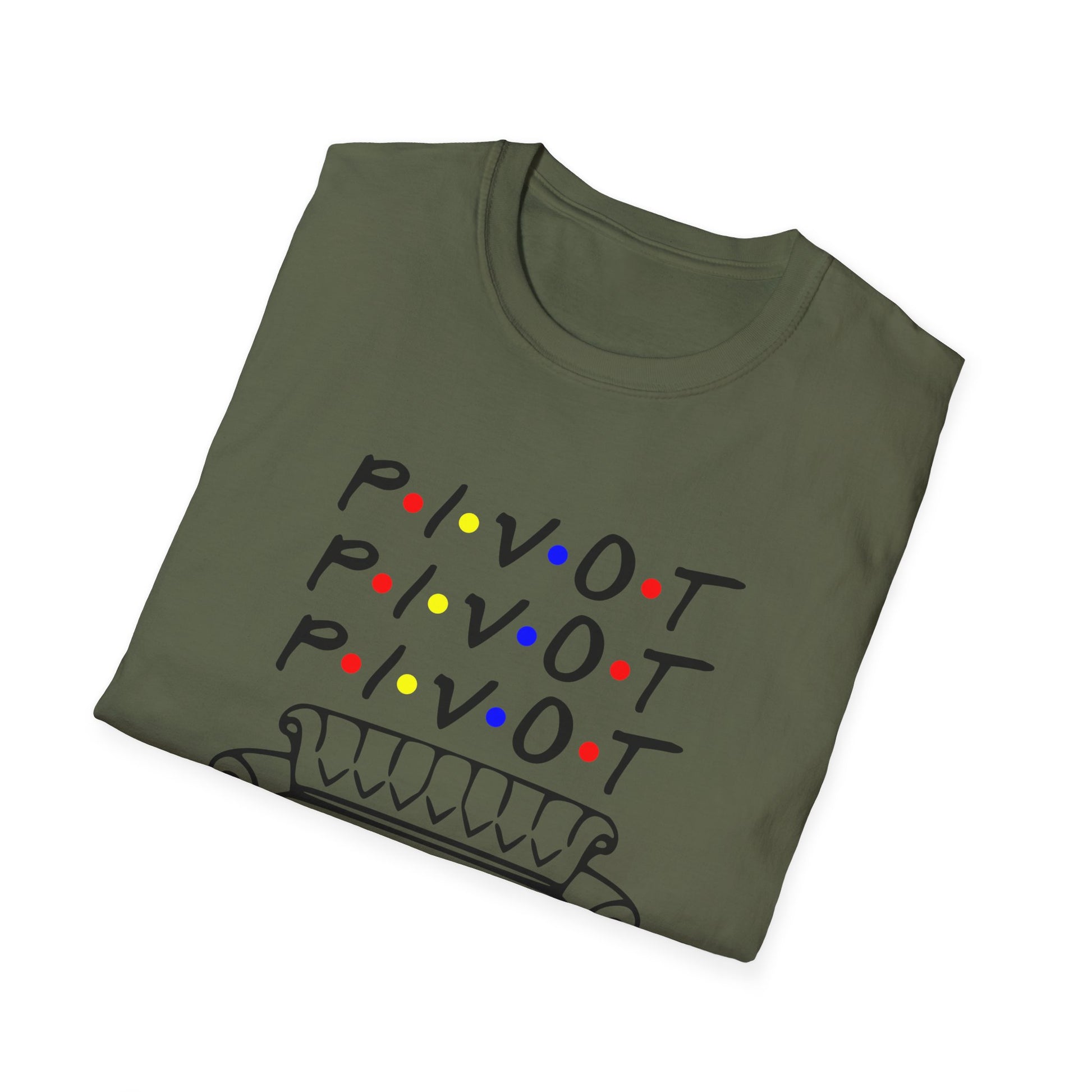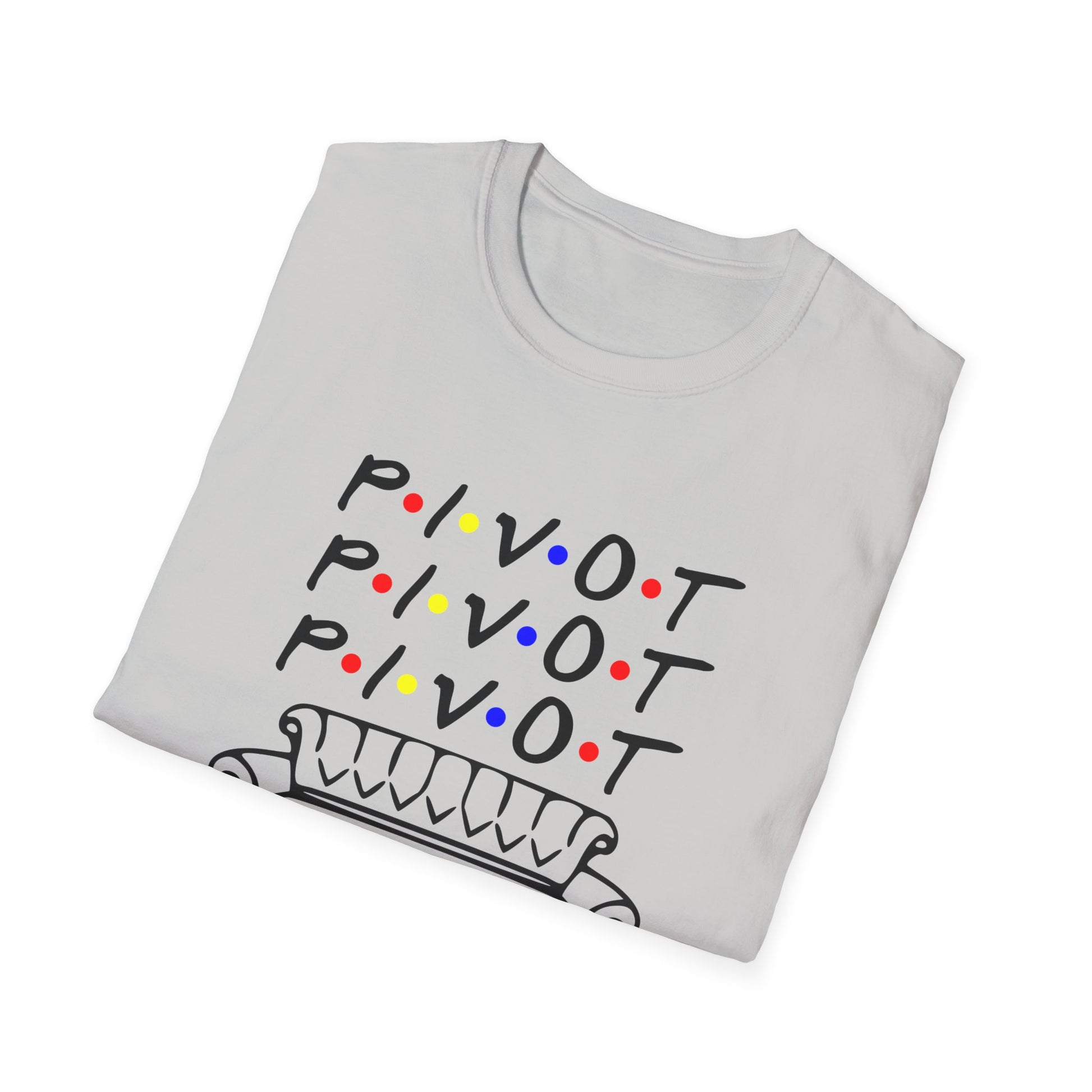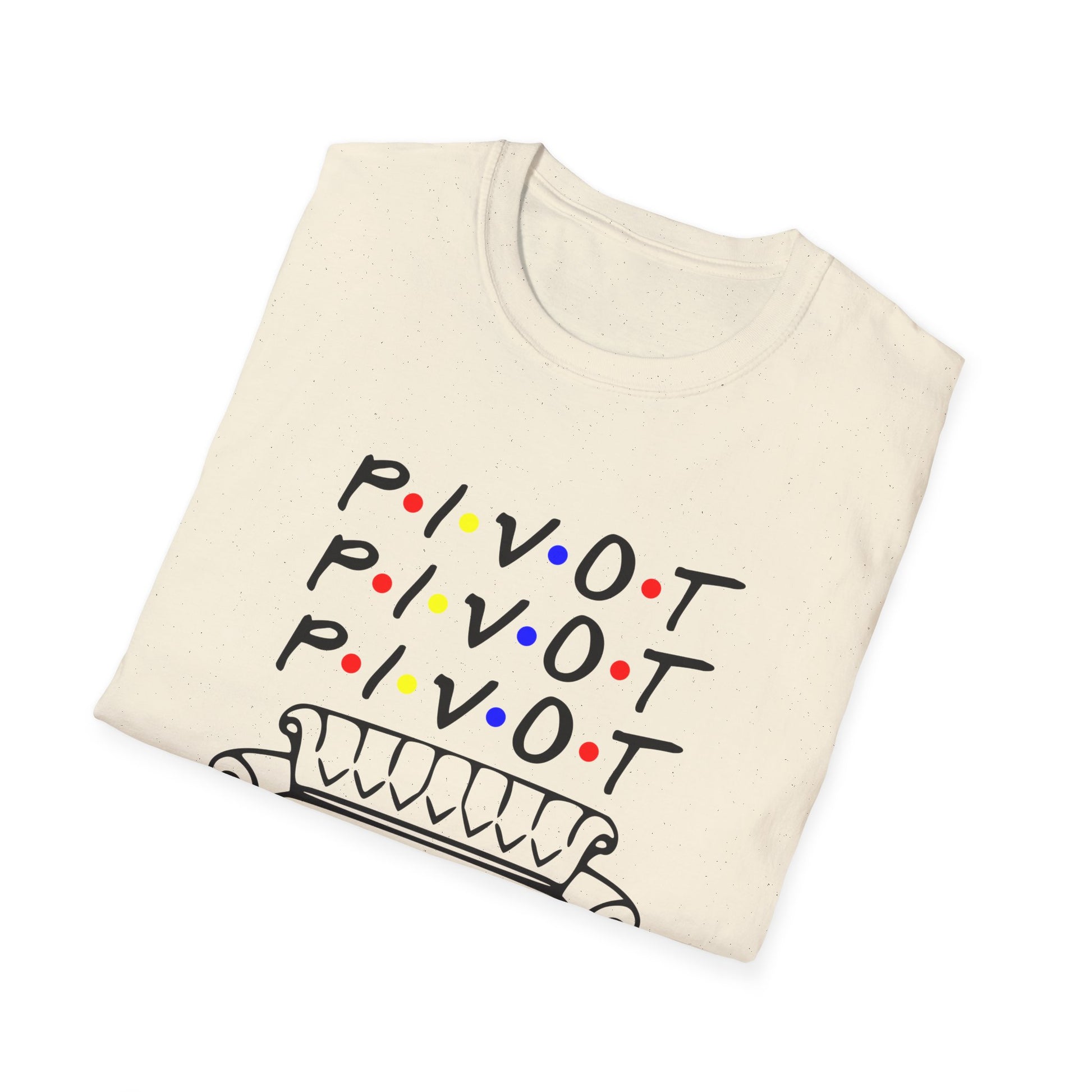 Pivot Couch T‑Shirt – "PIVOT" & "Shut Up" Friends Quote Tee