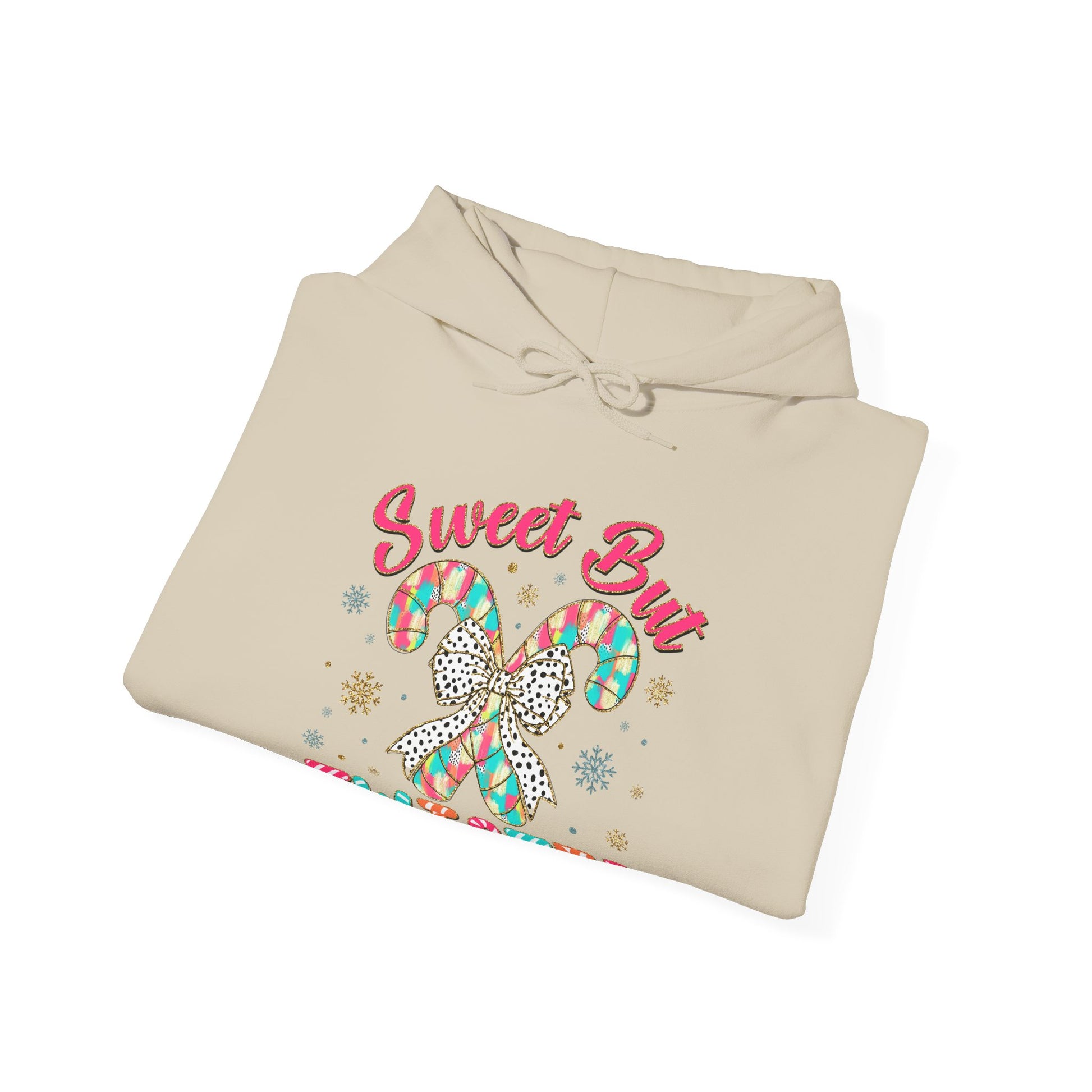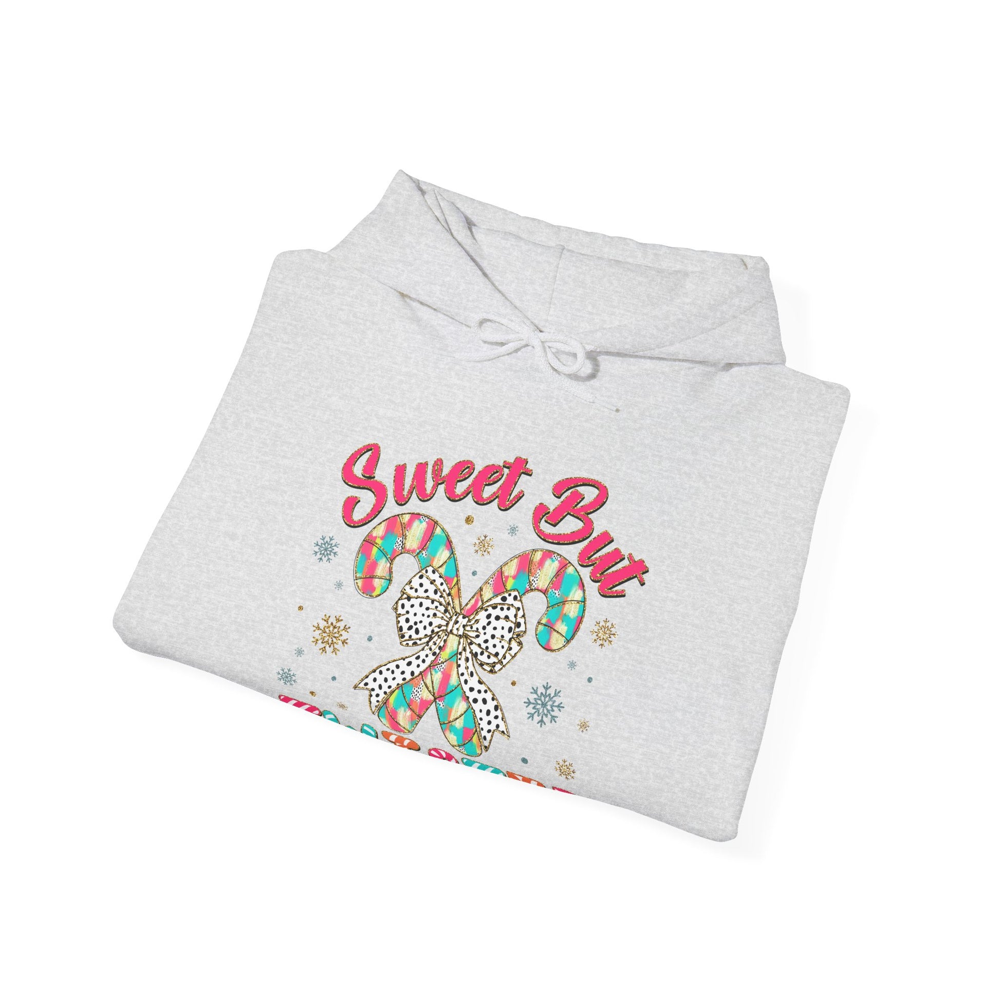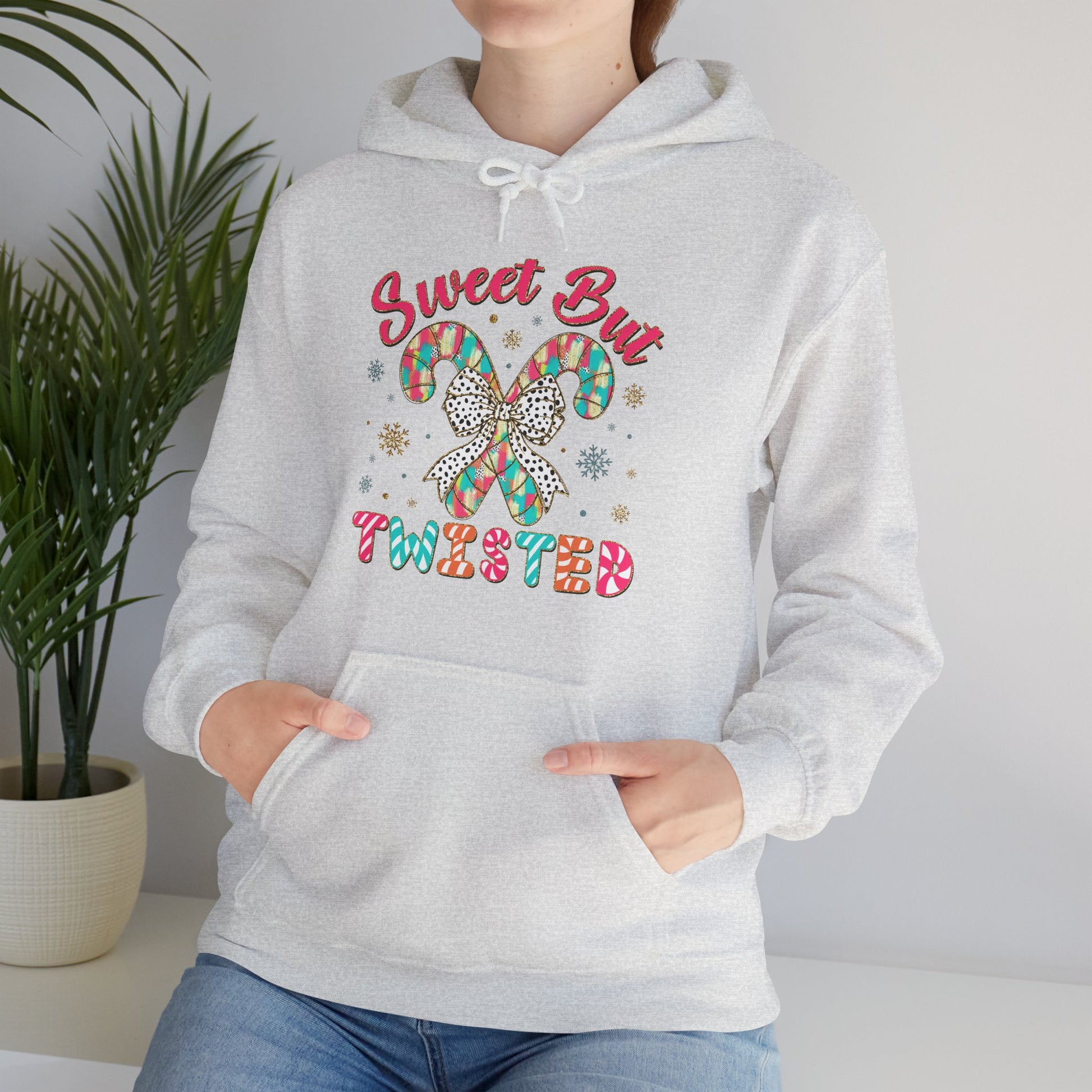 This cozy hoodie wraps you in a playful, holiday-ready vibe. Soft white fleece becomes a canvas for a colorful, slightly mischievous candy-cane bow graphic with hand-drawn details and scattered snowflakes. The message reads “Sweet But Twisted,” balancing sugary charm with a wink of sass — wear it while sipping hot cocoa, trimming the tree, or lounging through a slow winter morning. The roomy kangaroo pocket and double-lined hood keep cold at bay. It feels lived-in from the first pull-on: warm, a little cheeky, and totally comfortable.